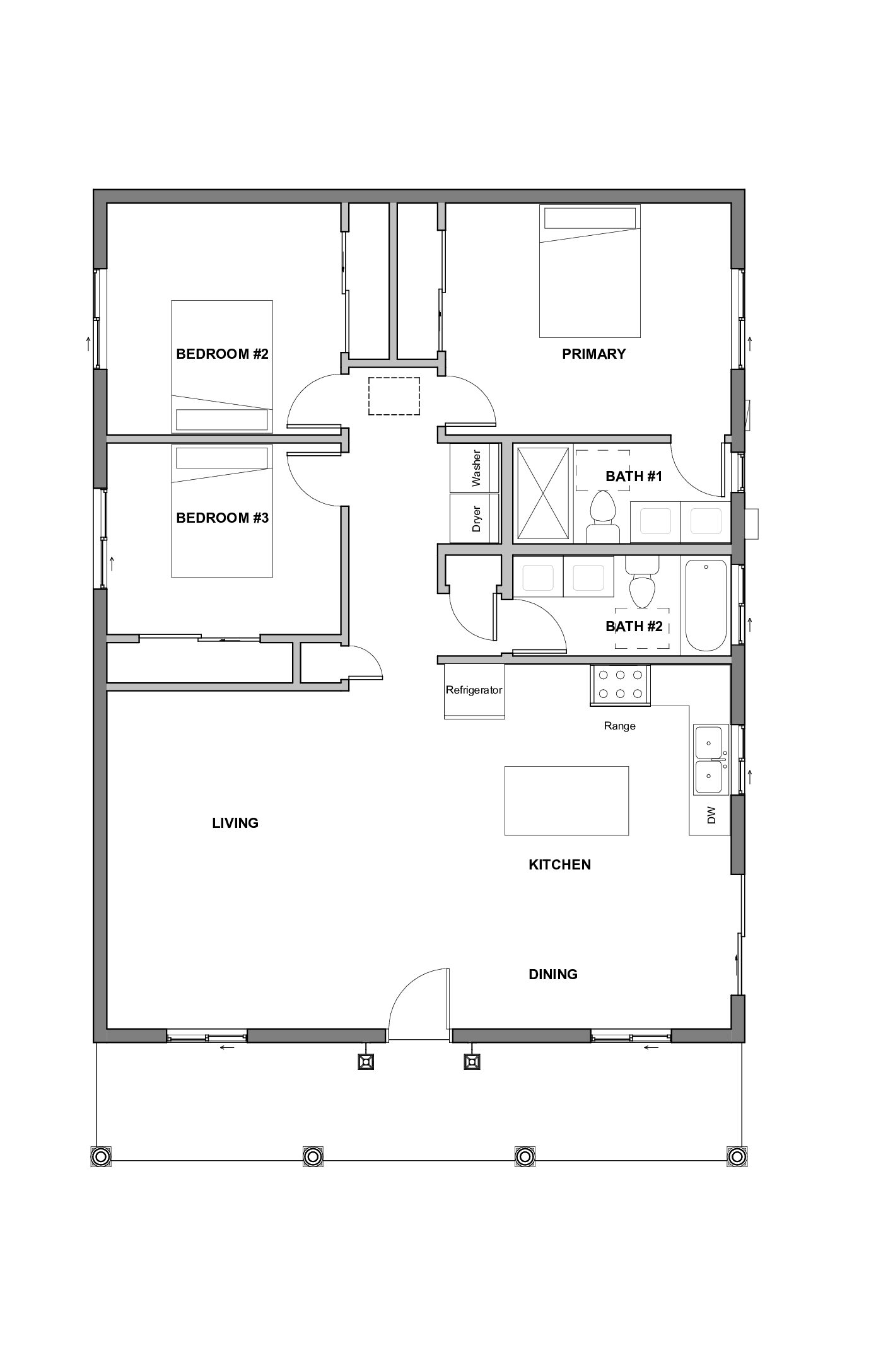 Este es nuestro plano de planta para una casa de tres dormitorios y dos baños.